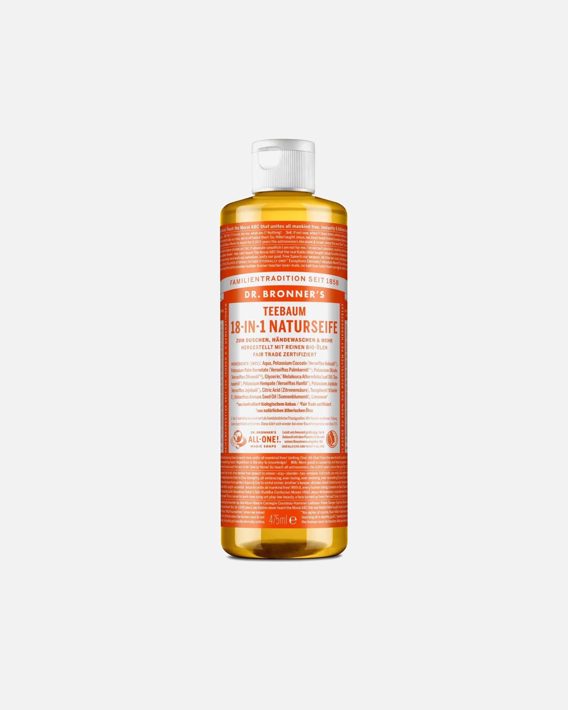 Il sapone liquido Dr. Bronner's 18 in 1 è il prodotto di punta del marchio. È il sapone più venduto negli Stati Uniti sul mercato dei prodotti naturali. Lo si può utilizzare in 18 modi diversi: per lavarsi il corpo, il viso, i capelli, per radersi, ma anche per lavare i piatti o pulire i pavimenti. È un sapone multifunzione ed efficace in tutte le situazioni. Viene prodotto seguendo la tecnica della saponificazione a freddo, con l'olio d'oliva come ingrediente principale. Gli oli essenziali con cui è profumato apportano tutti i loro benefici e permettono un'ampia scelta di fragranze gradevoli. Oltre che nella versione liquida, puoi trovare anche il sapone solido Dr. Bronner’s, con o senza profumo.
